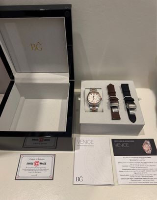 Reloj BG Venice con detalles en tonos dorados y plateados. Incluye dos correas adicionales, caja y certificado de autenticidad. Esfera grabada al estilo guilloché con incrustación de 9 topacios azules 1,5 mm cada uno.Bisel con baño de oro Bisel con baño de oro rosa PVD. Caja redonda de 34 mm.Corona con baño de oro rosa PVD con logo BĜ.Cristal frontal de zafiro antirralladuras resistentes a golpes y roces. Resistente al agua 50 metros. Correas de piel negra, marrón, y acero con cierre clásico botones a los lados y sistema easy release.Certificado de autenticidad y numeración y Certificado de Swiss Made. Modelo valorado 1625€