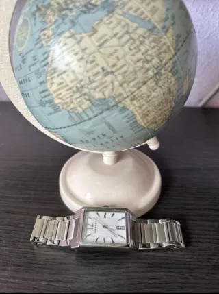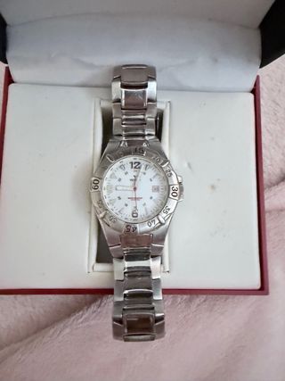 RELOJ PRACTICAMENTE SIN USAR. Fue un regalo, tiene un precio de 110€, lo vendo porque no lo uso: - Conservo caja original y papeles. - Caja y correa de metal plateado. - Esfera blanca con detalles plateados.
