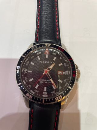 Reloj Viceroy para caballero con un diseño elegante y moderno. Perfecto para el día a día. Con pila y hermetismo se puede enviar por v i n t e d - Correa de cuero negra con pespuntes rojos. - Caja de acero inoxidable plateada. - Bisel giratorio con indicaciones de brújula. - Esfera con diseño texturizado y detalles en rojo. - Indicador de fecha.