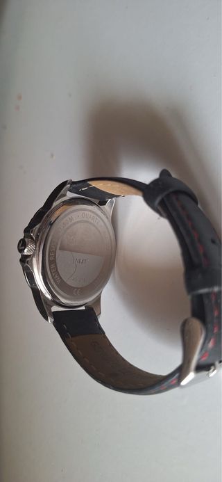 Reloj de pulsera con diseño moderno. - Correa de cuero negra con pespuntes rojos. - Esfera blanca con detalles plateados. - Bisel con marcadores de tiempo.