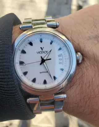 Elegante reloj de pulsera Viceroy con esfera blanca y detalles plateados. - Diseño clásico y atemporal. - Resistente al agua hasta 150 pies.