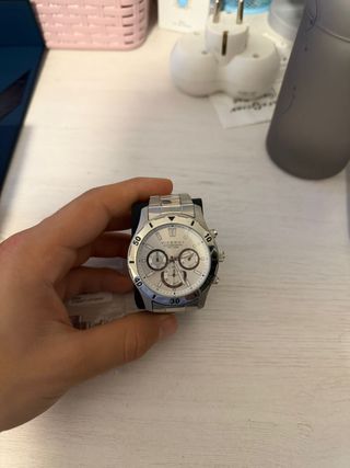 Reloj de pulsera con diseño deportivo y elegante. - Esfera blanca con detalles en azul. - Correa de metal plateado. - Bisel con marcadores. Con su caja original oficial
