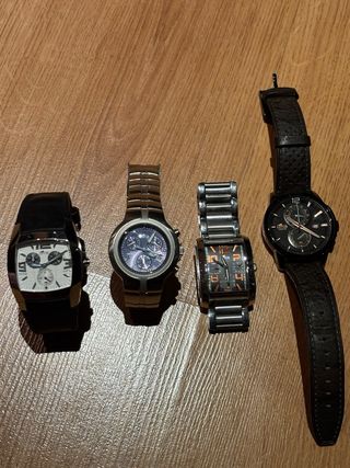 Conjunto de siete relojes para hombre con diseños variados. Reloj viceroy fase lunar poner pila Reloj Cauny matic automático funcionando Reloj Radiant para poner pila Reloj casio tank con pila Reloj michelin para poner pila Reloj senado atletico de madrid para poner pila Reloj Timberland con pila