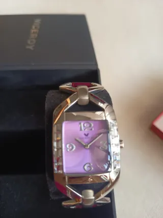 Elegante reloj Viceroy con un diseño moderno y llamativo. Totalmente Nuevo, en su caja original, nunca se ha usado. - Esfera rectangular de color morado. - Detalles de cristales alrededor de la caja. - La pulsera es de piel.