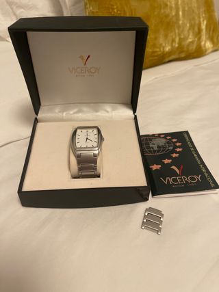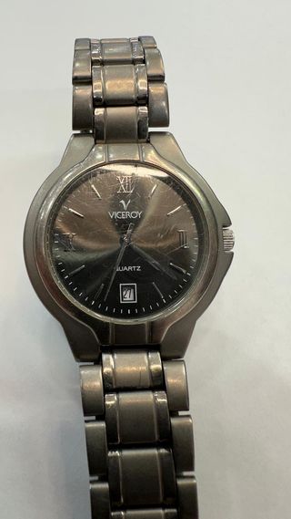 Vendo reloj Viceroy Quartz original, referencia 43025. Características: • Movimiento de cuarzo (funciona con pila). • Caja y correa de acero inoxidable. • Diámetro: 35 mm aprox. • Resistente al agua. • Esfera blanca con números romanos y ventana de fecha. Estado: Buen estado, funcionando correctamente. Pila recién cambiada. Presenta una raya inapreciable en el cristal de la esfera (ver fotos)