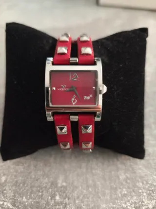 Elegante reloj Viceroy con un llamativo diseño. - Pulsera de cuero roja. - Detalles metálicos tipo tachuelas. - Esfera rectangular. - Estado general bueno, con signos normales de uso acordes a su antigüedad (ver fotos). -Ideal para coleccionistas, fans de Shakira (es una edición que saco ella) o para quien busque un complemento diferente y con personalidad. Disponible entrega en mano en Valencia o envío.