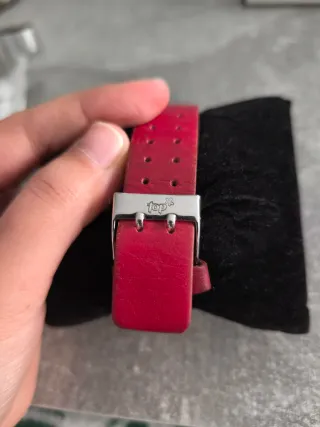 - 39 mm aprox en la parte más ancha. - Correa de cuero de color burdeos, con signos de desgaste sobre todo en el interior (ver fotografías). - Precisa cambio de pila.
