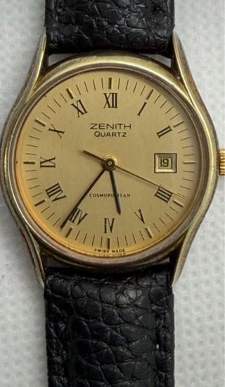 Elegante reloj Zenith Cosmopolitan con un diseño clásico y sofisticado. - Esfera dorada con números romanos. - Ventana de fecha. - Correa de piel negra. - Fabricado en Suiza. - Perfecto funcionamiento recién revisado