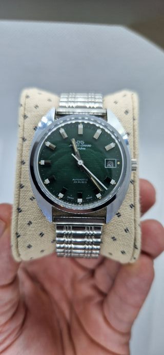 Reloj de pulsera Jaquet Girard con movimiento automático. - Esfera de color verde. - Ventana de fecha. - Correa de metal plateada. - 25 rubíes. Marca: Jaquet Girard [Perteneciente a la casa Zeno Watch basel] Modelo: Green Golf Calibre: AS2063 (automático) Joyas: 25.- Alternancias: 21.600 Reserva de horas: 44h Diámetro: 35.0 mm Esfera: Verde Cristal: Plexi Caja: Acero, acabado cromo.- Correa: 18 mm / Acero Flexo-Flex. Revisión: 2023 Estado: Excelente, casi NOS.-