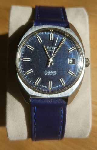 Reloj Lanco automático con un diseño clásico y elegante. - Esfera de color azul con textura. - Indicador de fecha. - Correa de piel azul. - Movimiento automático de 25 rubíes. - Incabloc para protección contra golpes. Marca: Lanco Modelo: - Calibre: AS2063 (automático).- Otros fabricantes que montaron este calibre: Mondia, Royce, Zeno, Olma o Blancpain.- Joyas: 25.- Alternancias: 21600 Reserva de horas: 46h Diámetro: 34.5 mm.- Esfera: Azul intenso (con textura cuadrícula).- Cristal: Plexi Caja: Acero, cromada.- Correa: 18 mm / Nueva Cuero, made in Italy. Revisión: 2.025.- Estado: Usado. Muy Bueno. Funciona muy bien.-