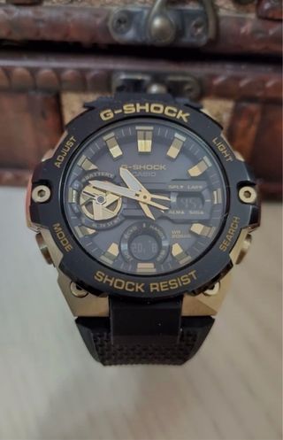 Reloj Casio G-Shock con detalles en dorado y correa negra.Se entrega sin caja - Esfera con manecillas y marcadores dorados. - Pantalla digital. - Bisel y caja con acabado en dorado. - Correa de resina negra.