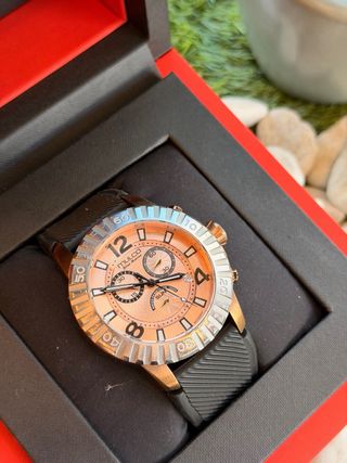 Elegante reloj Maserati Potenza con detalles en negro y oro rosa. Marca: Maserati Modelo: Potenza Diámetro de caja: 42 mm Grosor: aprox. 11 mm Material de caja: Acero inoxidable PVD oro rosa Correa: Silicona / caucho negra Movimiento: Cuarzo japonés Funciones: Hora, fecha Cristal: Mineral Cantidad de piñones: 0 Color: Negro con detalles oro rosa Resistencia al agua: 100 m Año aproximado: 2019–2022 - Diseño moderno y sofisticado. - Correa de malla. - Bisel con marcadores de hora.