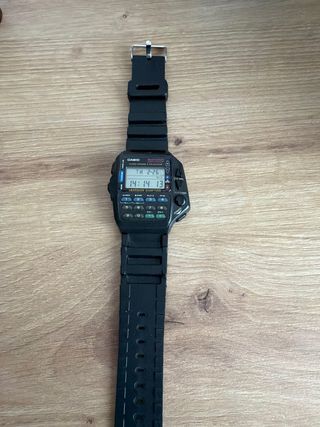 Reloj Casio modelo 1174 con calculadora integrada. Un accesorio funcional y versátil. - Diseño en color negro. - Funciones de calculadora y alarma. - Funciona a la perfección. - Correa no original. - Hay un enganche de la correa que está un poco mal pero creo que algún manitas podría arreglarlo. - Es un reloj mítico y muy buscado. - Pieza de coleccionista