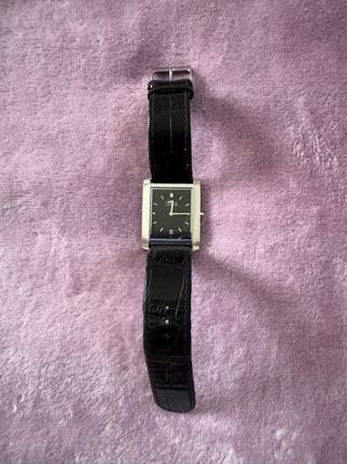 Reloj de pulsera con correa de cuero. Es original y está sin pila. Se ha utilizado (por eso el precio tan reducido) pero funciona a la perfección y el estado es muy bueno (se puede cambiar la correa) - Correa de cuero azul. - Esfera negra.