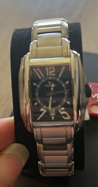 Reloj con diseño moderno y elegante. - Caja cuadrada. - Correa de eslabones. - Esfera negra con detalles plateados.