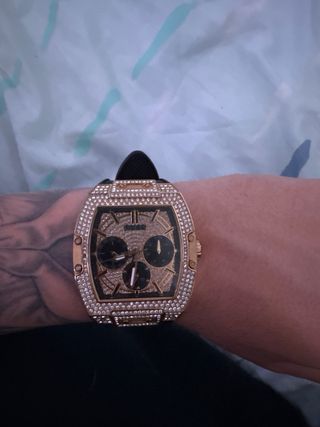 Elegante reloj Guess con un diseño llamativo y detalles brillantes. - Bisel adornado con cristales. - Esfera con múltiples subesferas. - Correa de material negro. Esta nuevo tiene muy poco uso .