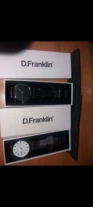 Dos relojes de la marca D.Franklin, uno en color negro y otro en blanco. Ambos con correa de malla. Precio unidad. - Reloj negro con esfera oscura. - Reloj blanco con esfera clara y detalles en negro.