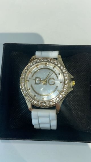 Elegante reloj D&G con un diseño llamativo. HAGO ENVIOS 🚚 - Bisel adornado con circonitas. - Esfera blanca con detalles dorados. - Correa de caucho negra.