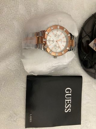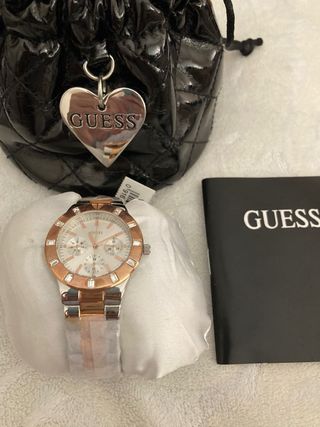 Elegante reloj Guess con detalles de piedras y una combinación de colores oro y plata. - Diseño con múltiples esferas. - Bisel adornado con cristales.