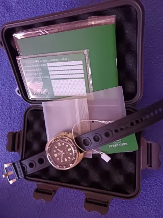 Reloj Steeldive Capitán Willard con caja y correa prácticamente a estrenar. Incluye su caja original y documentación. Posible cambio por G-shock o similar. - 200 metros - corona roscada. - Cristal de zafiro. - Caja de acero inoxidable. - Correa de caucho. - Bisel giratorio de cerámica. - Esfera con marcadores luminosos.