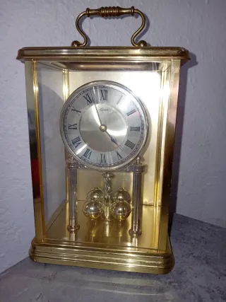 Elegante reloj de sobremesa con un acabado dorado brillante y detalles metálicos. - Diseño clásico con esfera y números romanos. - Péndulo decorativo en la parte inferior. - Asa superior para facilitar su transporte.