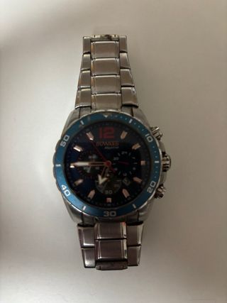 Reloj de pulsera con un diseño moderno y elegante. - Esfera azul con detalles plateados. - Correa de eslabones plateada.