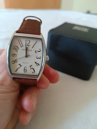 Elegante reloj Pertegaz con correa de cuero. - Correa de cuero con textura. - Caja plateada. - Esfera blanca con números.