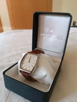Elegante reloj de pulsera Pertegaz para mujer. - Esfera de color blanco con detalles dorados. - Correa de piel marrón. - Caja de metal chapado en oro.