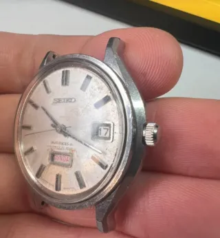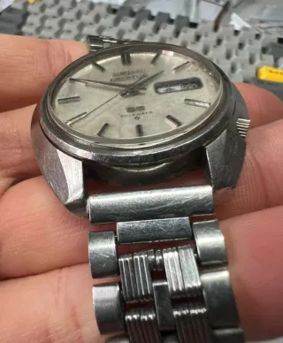 Reloj Seiko con esfera plateada y detalles en blanco. - Esfera con marcadores de hora plateados. - Ventana de día y fecha. - Correa de metal plateada. Esta para reparar