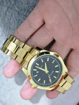 Elegante reloj con detalles dorados y esfera negra. - Diseño clásico y moderno. - Correa metálica dorada. - Indicadores horarios dorados.