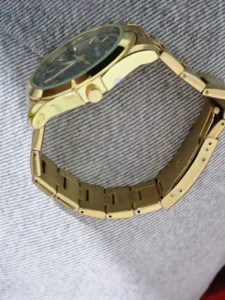 Reloj de pulsera Orient con calendario automático. - Esfera plateada con detalles dorados. - Correa de eslabones en tonos dorado y plateado. - Indicadores de hora dorados. - Ventana de fecha. Funciona pero la fecha no se puede cambiar