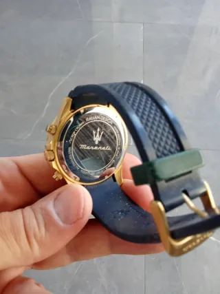 Elegante reloj Maserati con detalles en dorado y esfera azul. - Bisel con taquímetro. - Función cronógrafo. - Resistente al agua 100 metros. hay marcas de desgaste en el cuerpo