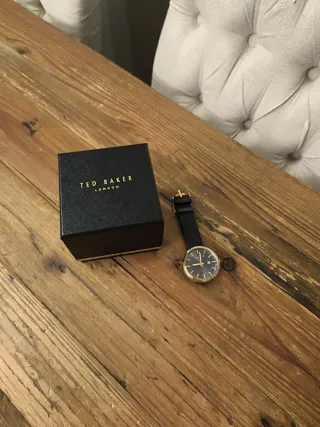 Elegante reloj de la marca Ted Baker. - Caja y correa en color negro. - Detalles en tono dorado en la esfera y la hebilla.