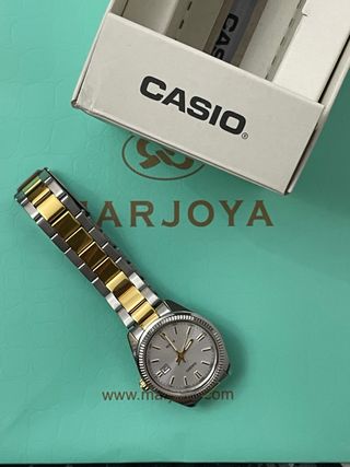 Elegante reloj Casio para mujer con un diseño bicolor que combina tonos dorados y plateados. Su brazalete metálico le da un toque sofisticado. - Diseño bicolor (dorado y plateado). - Brazalete metálico.