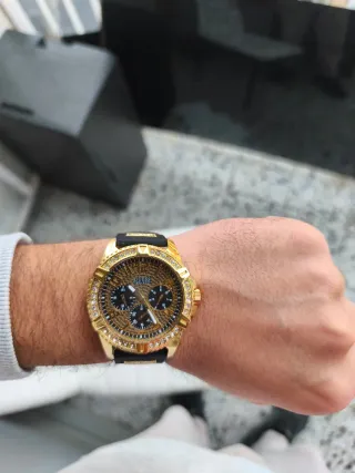 Elegante reloj Guess con un diseño llamativo. - Bisel adornado con cristales. - Correa de silicona negra. - Esfera dorada con detalles. - Caja de tono dorado. Se vende sin caja,