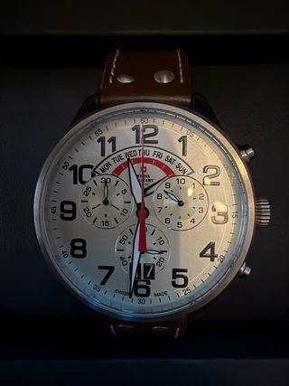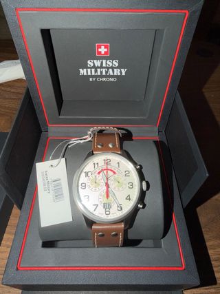 Reloj Swiss Military by Chrono SM34038.03 (Swiss Made). Solo abierto para verificar, sin uso. Caja 48 mm, cronógrafo con Ronda Mastertech 8040 (1/10s) + día retrógrado + big date. WR 100 m. Correa piel marrón. Incluye: caja, documentación/manual y etiqueta (ver fotos). Estado: como nuevo / sin uso (muestro en vídeo y fotos de detalle). Envío solo por Wallapop (portes incluidos). Por seguridad, solo a perfiles con valoraciones/historial. Vídeo previo de estado/funcionamiento + accesorios + embalaje; recomiendo grabar unboxing. Devolución solo por Wallapop y si vuelve el mismo artículo, completo y en el mismo