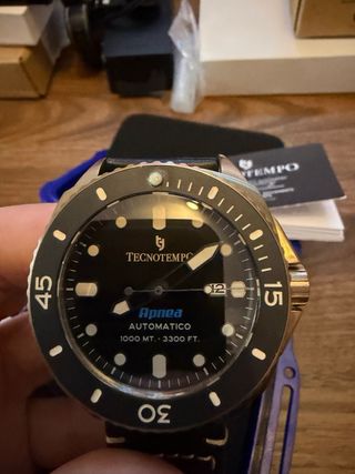 TECNOTEMPO “Apnea” Automatic Diver 1000M (TT.1000AP.LG). Automático mecánico, cristal zafiro y acero 316L. Diver grande con bisel unidireccional y fecha. Correa de piel original. Estado: como nuevo; puesto <10 veces, sin golpes ni marcas; marcha perfecta. Incluye estuche rígido, manual, garantía y etiqueta. Envío solo por Wallapop (portes incluidos). Por seguridad, solo a perfiles con valoraciones/historial. Vídeo previo de estado/funcionamiento + accesorios + embalaje; recomiendo grabar unboxing. Devolución solo por Wallapop y si vuelve el mismo artículo, completo y en el mismo estado (verificación por vídeo/fotos/serial).