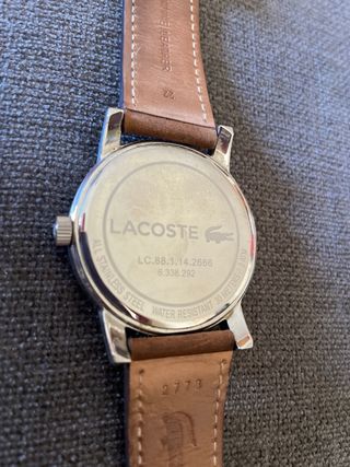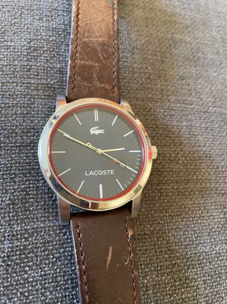 Elegante reloj Lacoste con correa de piel. - Esfera en color negro. - Detalle de aro rojo en la esfera. - Hebilla de acero inoxidable.
