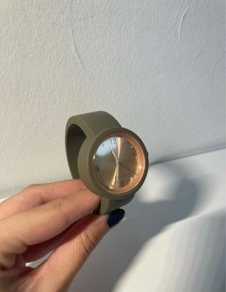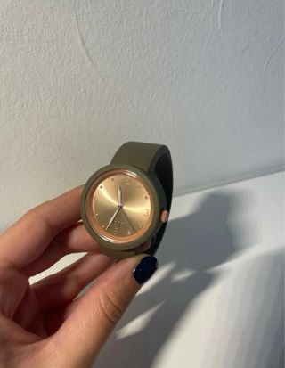 Reloj con correa de silicona en color verde oliva y esfera dorada. Un accesorio moderno y cómodo. - Correa de silicona flexible. - Esfera con acabado metálico dorado.