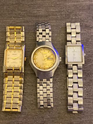 Lote de tres relojes de pulsera. - Un reloj Seiko con correa dorada y esfera rectangular. - Un reloj con correa plateada y esfera redonda dorada. - Un reloj Festina con correa plateada y esfera cuadrada. 100€ por todos