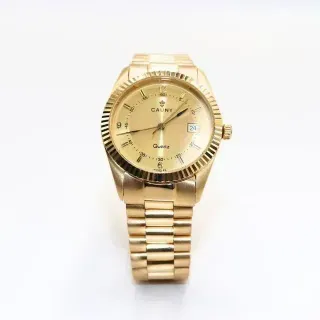 Reloj de pulsera con un diseño clásico y elegante. - Esfera de color dorado. - Brazalete de eslabones en tonos plateados y dorados. - Indicador de día y fecha.