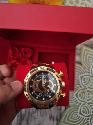Elegante reloj de pulsera con detalles dorados y esfera negra. - Diseño con múltiples esferas. - Correa metálica dorada. - Bisel con marcadores.
