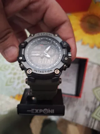 Reloj de pulsera con un diseño deportivo y moderno. - Correa de tela resistente en color verde. - Esfera principal en negro con detalles en blanco. - Caja robusta con botones laterales.