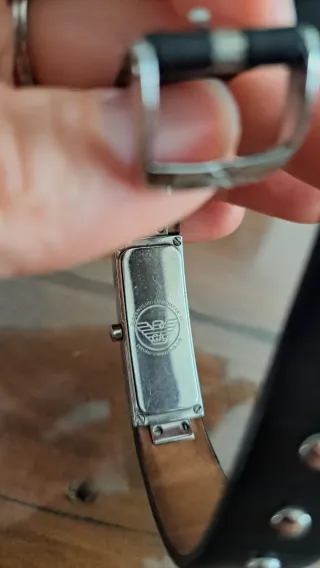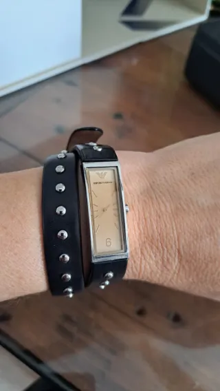 Elegante reloj Emporio Armani con correa de cuero. - Diseño rectangular. - Detalles metálicos en la correa. - Esfera dorada/rosa