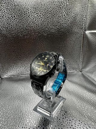 Reloj con esfera negra elegante y detalles dorados que le dan un toque moderno y sofisticado. Su correa metálica aporta resistencia y estilo, perfecto para el día a día o para lucir en ocasiones especiales. Precio negociable 😉⌚ - Diseño moderno y sofisticado. - Correa de eslabones metálicos.