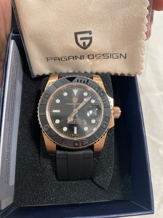 Elegante reloj de la marca Pagani Design con detalles en dorado y correa negra. - Esfera con detalles luminosos. - Bisel giratorio. - Resistencia al agua de 10 BAR/100M.