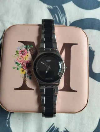 Elegante reloj Swatch con detalles en acero y nácar. - Combinación de colores negro y plateado. - Materiales de calidad. Para muñeca pequeña
