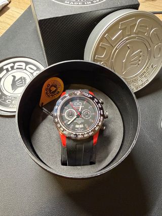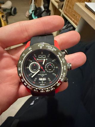 Reloj Bultaco Edición Sport con caja de 43mm y cronógrafo. Usado una vez, fue un regalo y no soy de relojes. - Esfera negra con detalles en rojo. - Correa de caucho negra muy cómoda. - Bisel con taquímetro. Caja original. Se tiene que cambiar la pila.