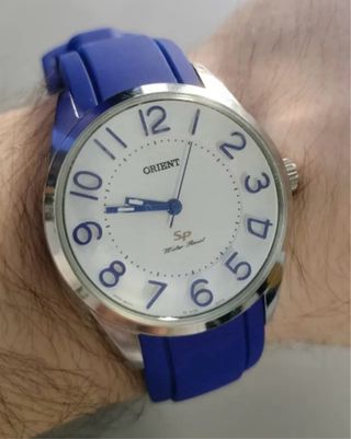Reloj de pulsera Orient con correa de silicona azul y esfera blanca. El modelo SP es resistente al agua. - Correa de silicona azul. - Esfera blanca con números grandes. - Resistente al agua. - Le falta cambiar la pila.