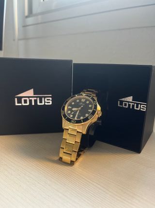 Elegante reloj de la marca Lotus con una combinación de colores dorados y negros. - Esfera negra. - Bisel giratorio. - Correa de eslabones dorada.